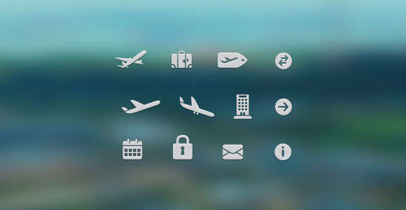 Free PSD travel icons (flights, calendar, luggage, lock, information, tag, et cetera) designed by Konrad.